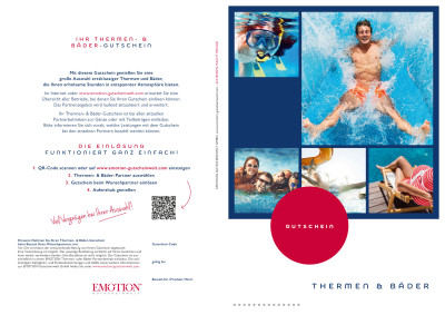 Entdecken Sie die Vielfalt der EMOTION Gutscheinwelt und tauchen Sie ein in eine Welt der Entspannung und Erholung mit unserem exklusiven Thermen & Bäder Gutschein. Wählen Sie den Wunschbetrag und schenken Sie unvergessliche Momente. Der EMOTION Thermen & Bäder Gutschein bietet Ihnen oder dem Beschenkten eine Vielfalt an Möglichkeiten. Flexibel und individuell einlösbar, verspricht dieser Gutschein besondere Wellness-Momente oder bleibende Erinnerungen in Freizeit- und Erlebnisbädern.